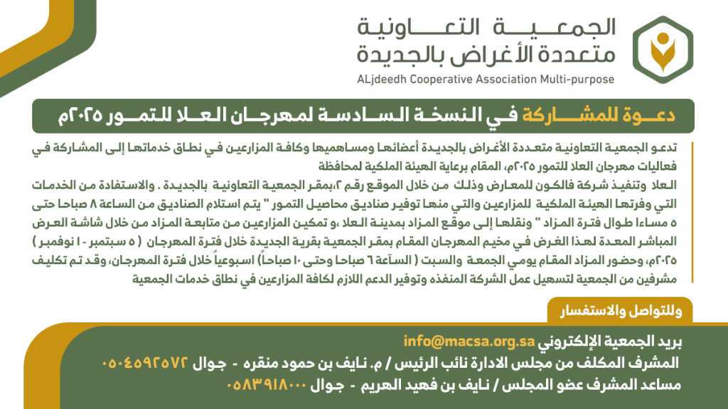 جمعية تعاونية زراعية متعددة الاغراض ، تسعى لتحقيق اهدافها الاستراتيجية باساليب احترافية مبتكره لتحقيق التنمية المجتمعية المستدامة في نطاق خدماتها ، والمساهمة في دعم رؤية الهيئة الملكية في العلا ومستهدفات رؤية المملكه ٢٠٣٠.